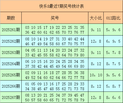 快乐8第2025267期奖号为:08 13 20 21 25 34 37 39 45 47 50 57 58 60 65 71 72 75 78 79,其中奖号012路比为8:6:6,大小比为12:8。